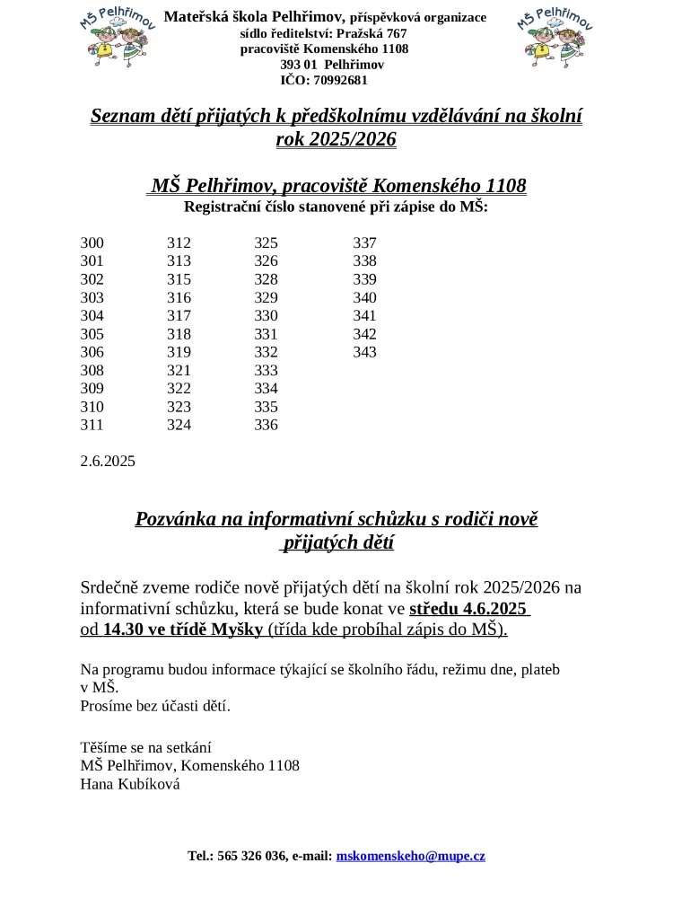 MŠ Pelhřimov » MŠ Komenského » Aktuality » Seznam dětí přijatých k předškolnímu vzdělávání na školní rok 2025/2026